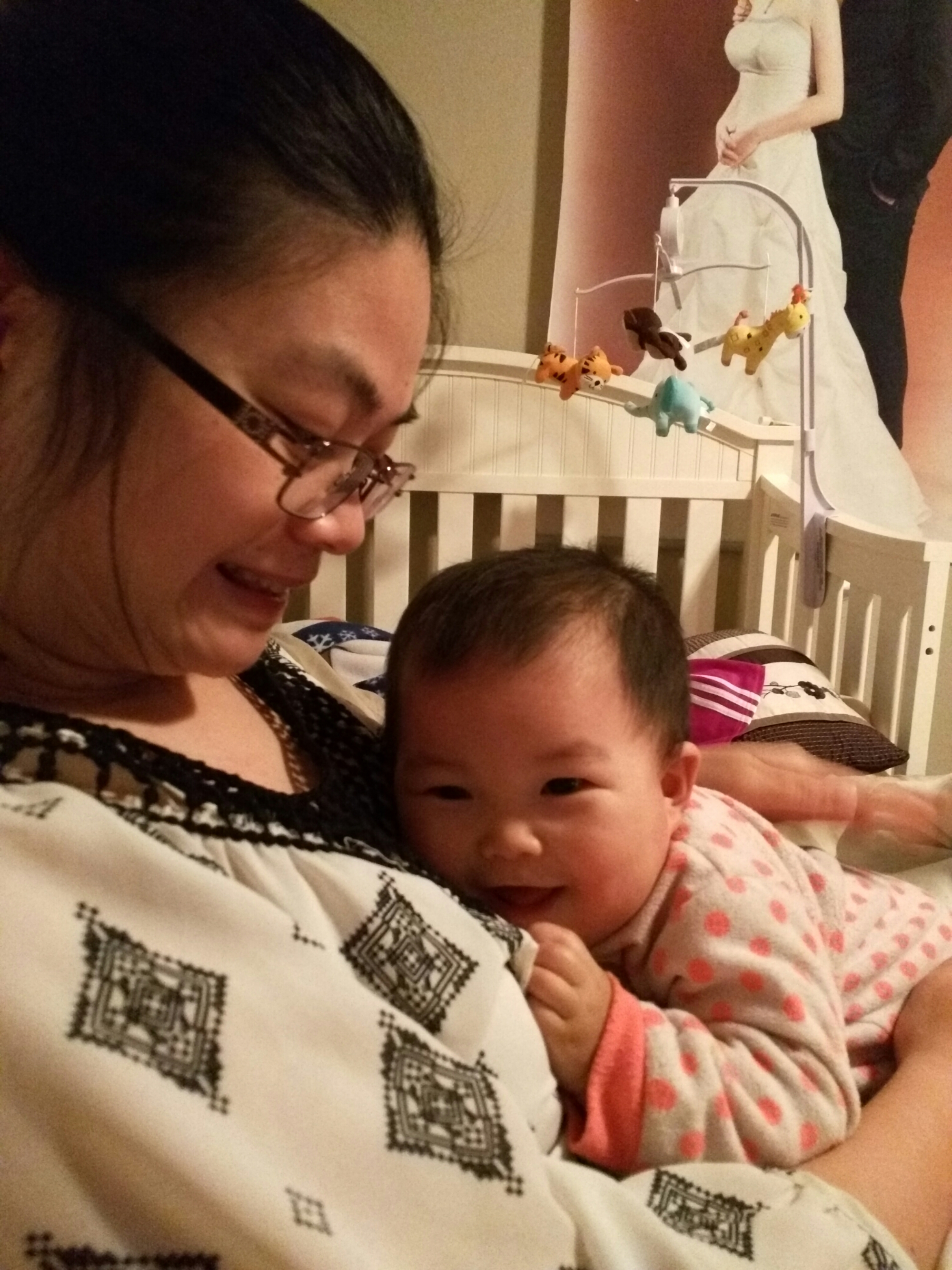 八点左右赵瑜来我们家,聊了会天然后我们就去楼下跳舞了,宝贝不久后就醒了,于是我们又上来逗宝贝了。宝贝坐在沙发上陪我们聊天,好撒娇地躺在妈妈身上,好像还是有些累。等赵瑜回家就把宝贝放床上睡觉了,刚开始还自己躺得好好的吃拇指,可几分钟后就大哭了,哭了好久都不停,爸爸洗完澡后看得舍不得就把宝贝给抱起来逛两圈。宝贝直到吃到奶才愿意睡觉呀~