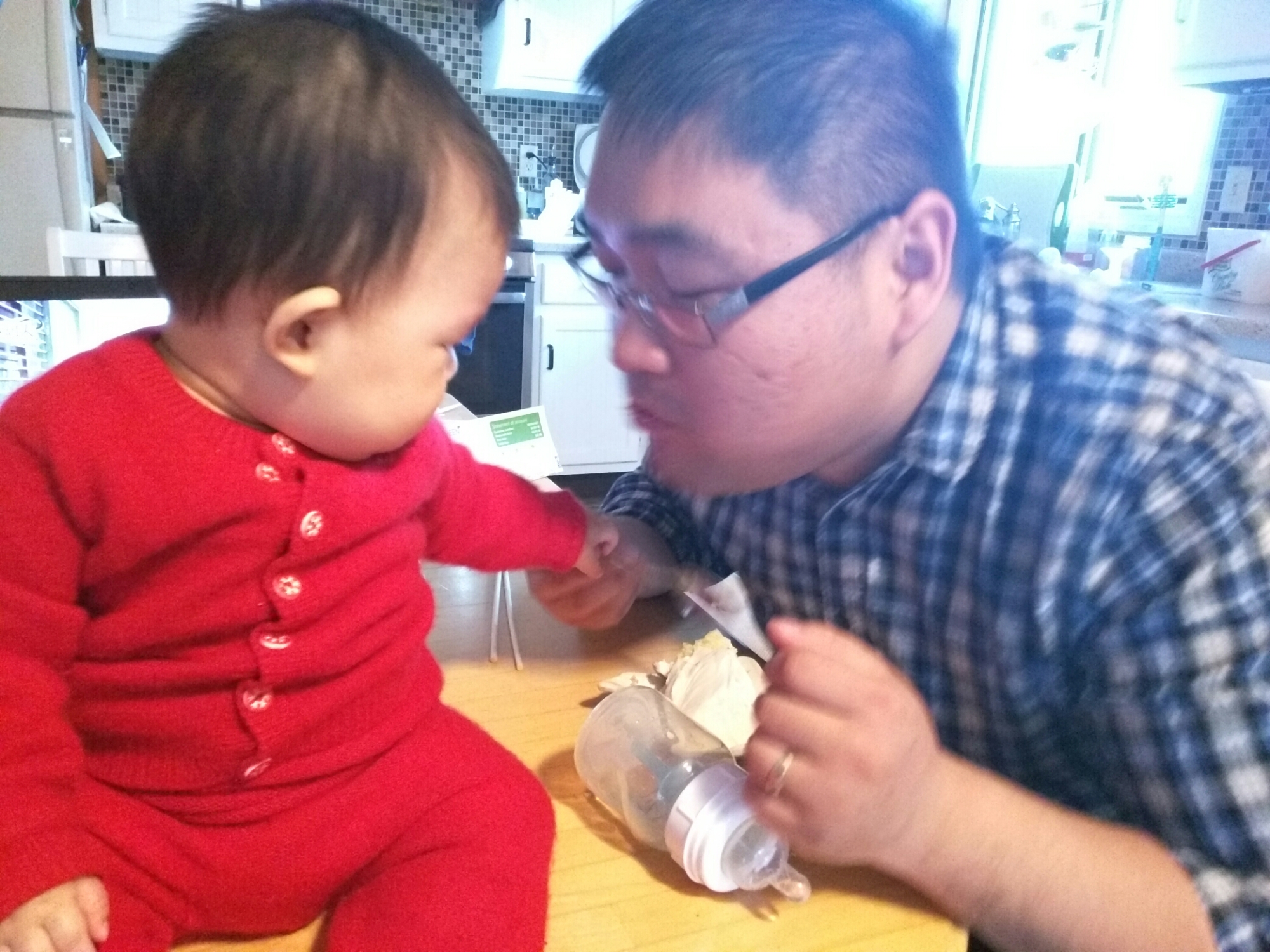 宝贝也吃了面,到最后就吃BIB了,宝贝最后不吃就在那喊起来,只能让爸爸先把宝贝抱起来陪着玩。