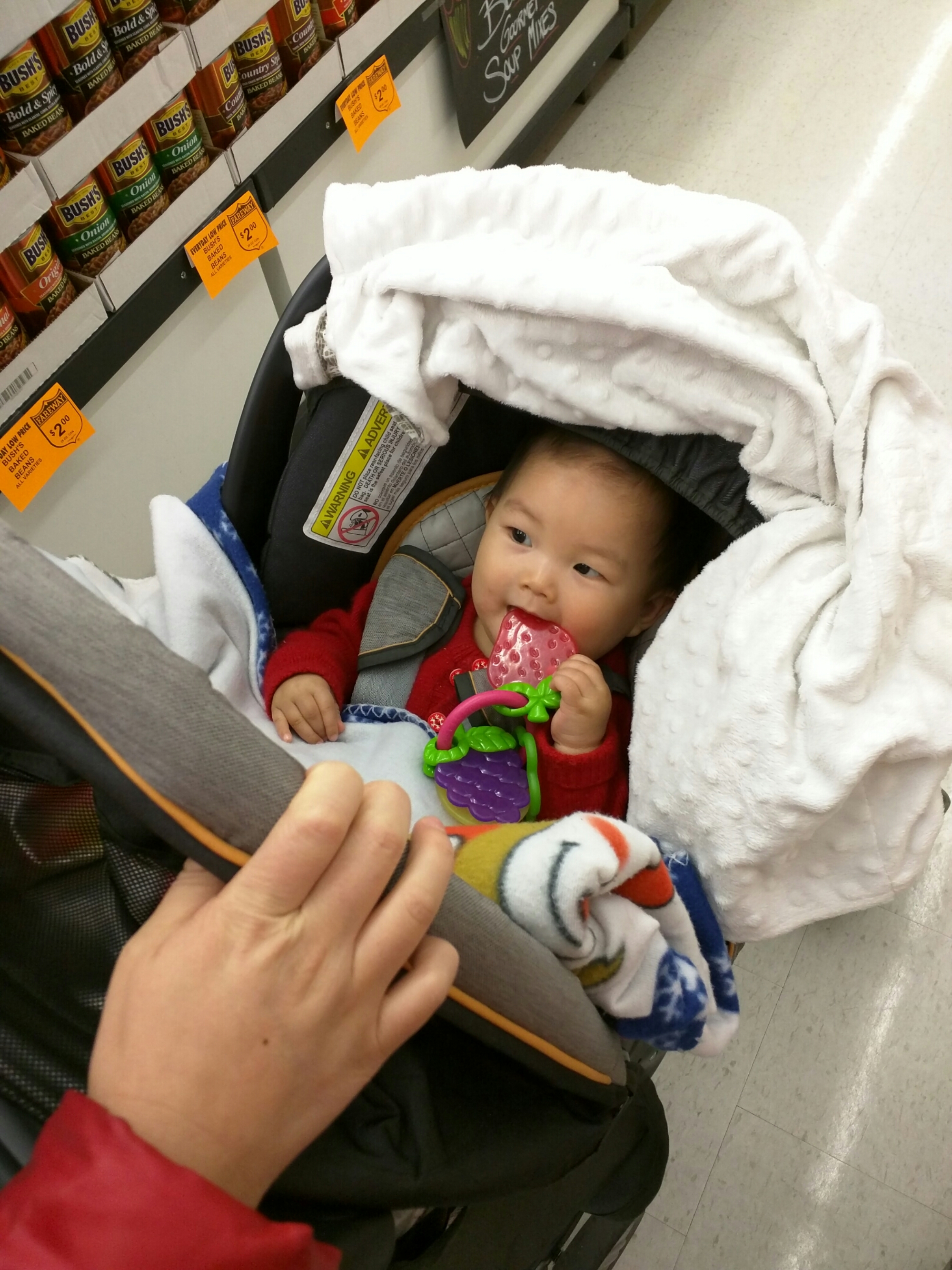 我们去了fare way grocery shopping 买了这周的菜,还有宝贝也没有东西吃了。宝贝一直很乖地躺在car seat 里。