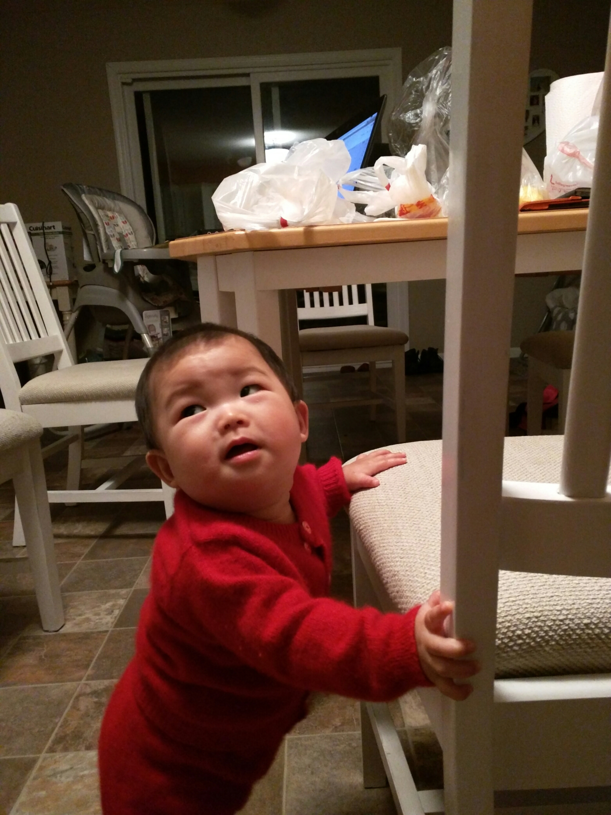 4/12 今天爸爸把车给卖了,爸爸妈妈都早下班,车卖了后我们就接宝贝走路去银行存钱,然后走到target,我们休息了一会,然后爸爸在网上Buffalo wings上订了些鸡翅,然后我们走过去 pick up。宝贝能出来外面走好开心噢,爸爸妈妈轮流抱着宝贝,这样就可以看看外面的风景。晚饭我们就吃鸡翅了,宝贝没得吃,因为都是肉,味道太重。