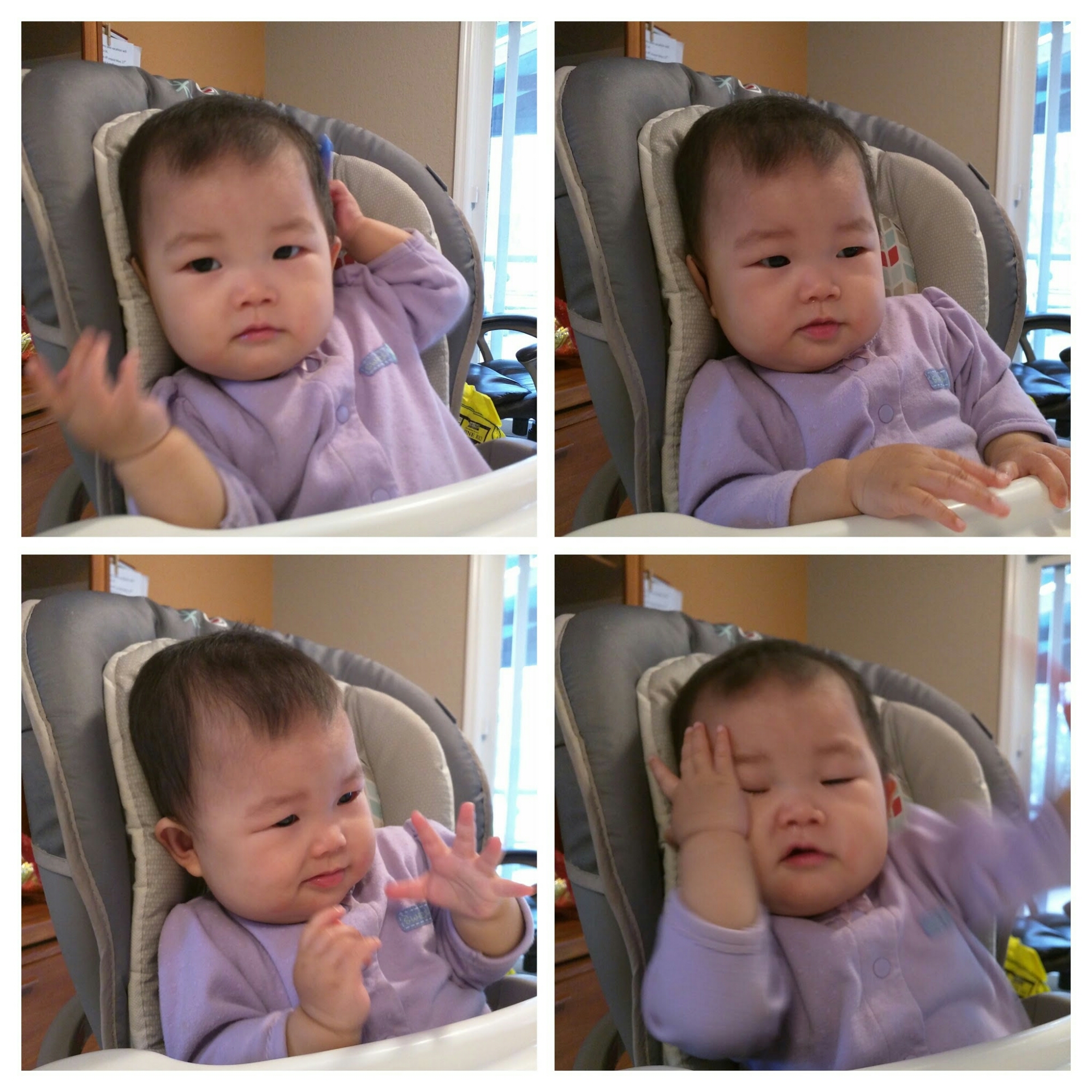 ,哥哥姐姐抢着给宝贝摇car Seat,宝贝也很乖的躺着。等到了我们要吃了宝贝就不愿意自己躺着了。爸爸拿了宝贝的椅子和我们一起坐着,宝贝当然也想一起吃。回家的路上宝贝又睡了一觉。晚上和爷爷奶奶视频。爸爸很晚回家,于是妈妈先弄了点打包回来的食物给宝贝吃,胃口真是好,吃了好多,妈妈中间给宝贝水这样就可以多吃点。宝贝今天还自己玩学步机玩了好久。