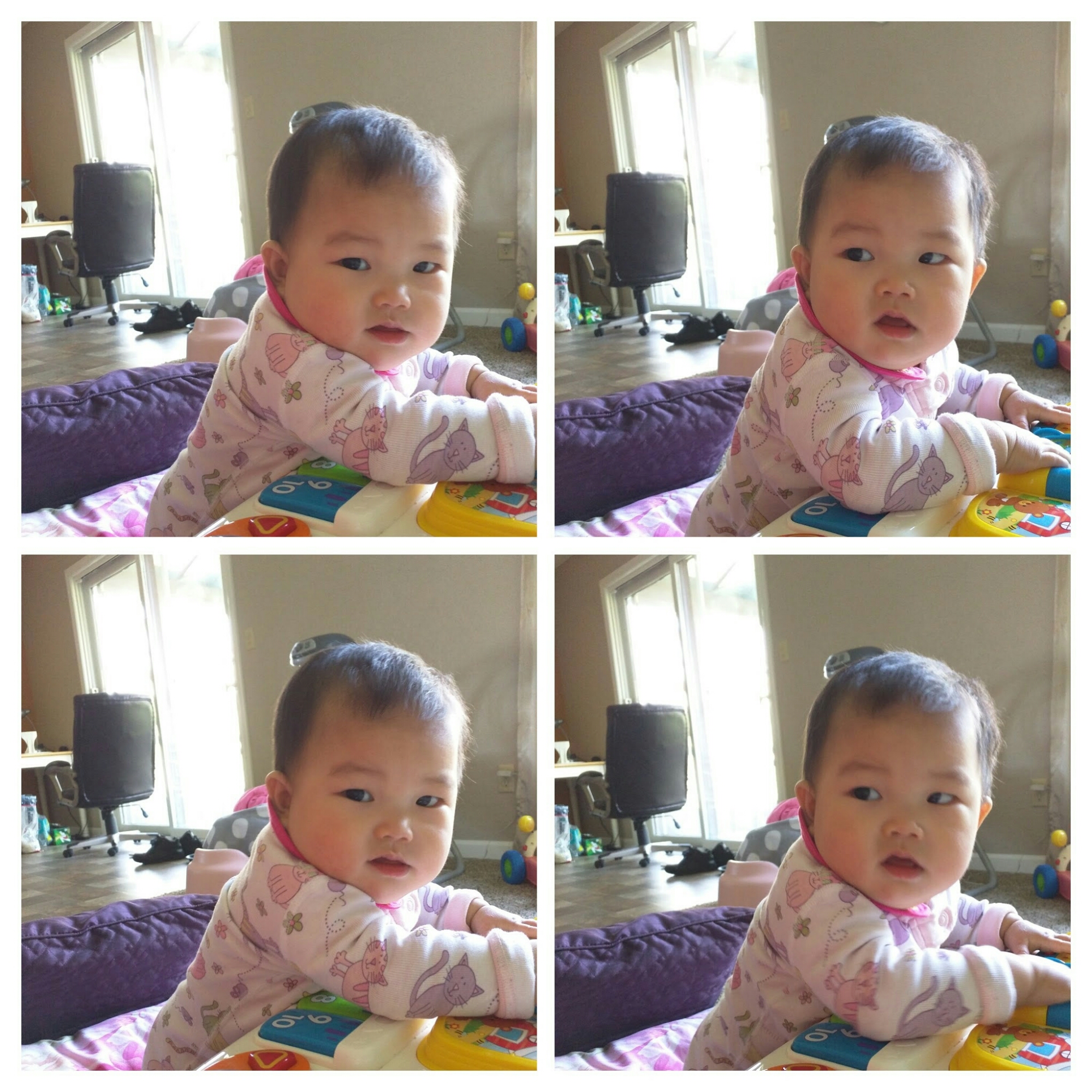今天爸爸去加班了,妈妈和宝贝在家里。宝贝今天可乖了。早上起床妈妈帮宝宝换了衣服和尿包子然后让宝贝坐在椅子上吃cereal,妈妈在旁边看视频还有喝粥宝贝也不吵,也让宝贝吃几口粥,第一次吃感觉还很奇怪。到了十二点多宝贝好像有些累了,所以就到床上,宝贝很乖的躺着自己玩,妈妈放点crib上的音乐,然后在旁边折起了衣服,偶尔还逗下宝贝,不久后爸爸回来了。