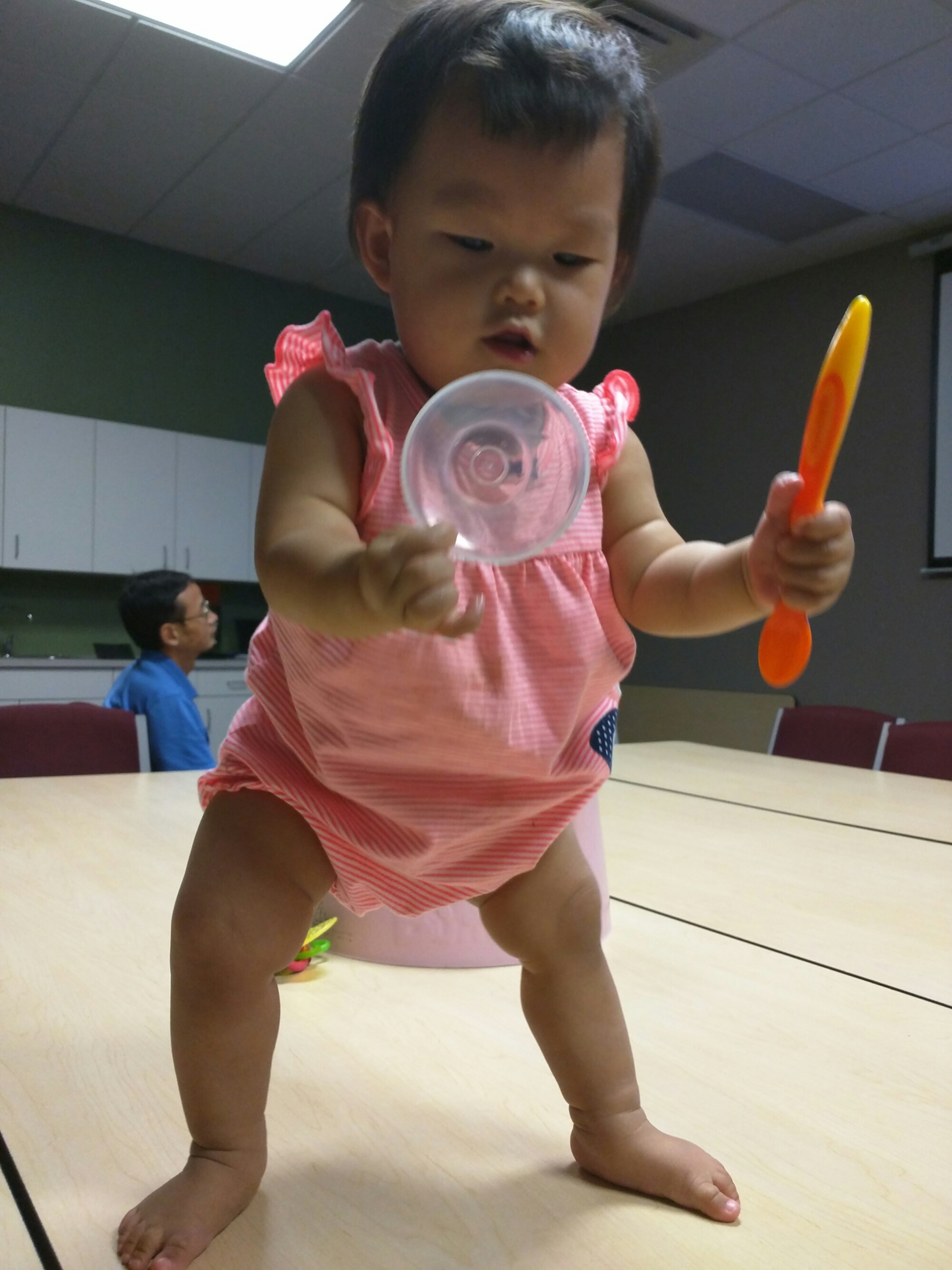 8/19 今天妈妈回家宝贝在玩具房里看视频听歌,爸爸做晚饭。爸爸说宝贝太好笑了,听歌听得好认真,爸爸说妈妈没看到更好笑的呢,宝贝之前是扶着 stand up toy 挂那在那听歌,然后换着姿势听。妈妈回来了跑到宝贝背后,都没有被发现。晚上去教堂宝贝好活泼,今天人也多。宝贝把 cereal 都快吃完了, 三姨在旁边看着笑宝贝吃得那么快,一口还没吞下去继续抓,然后直接手伸瓶子里自己拿。