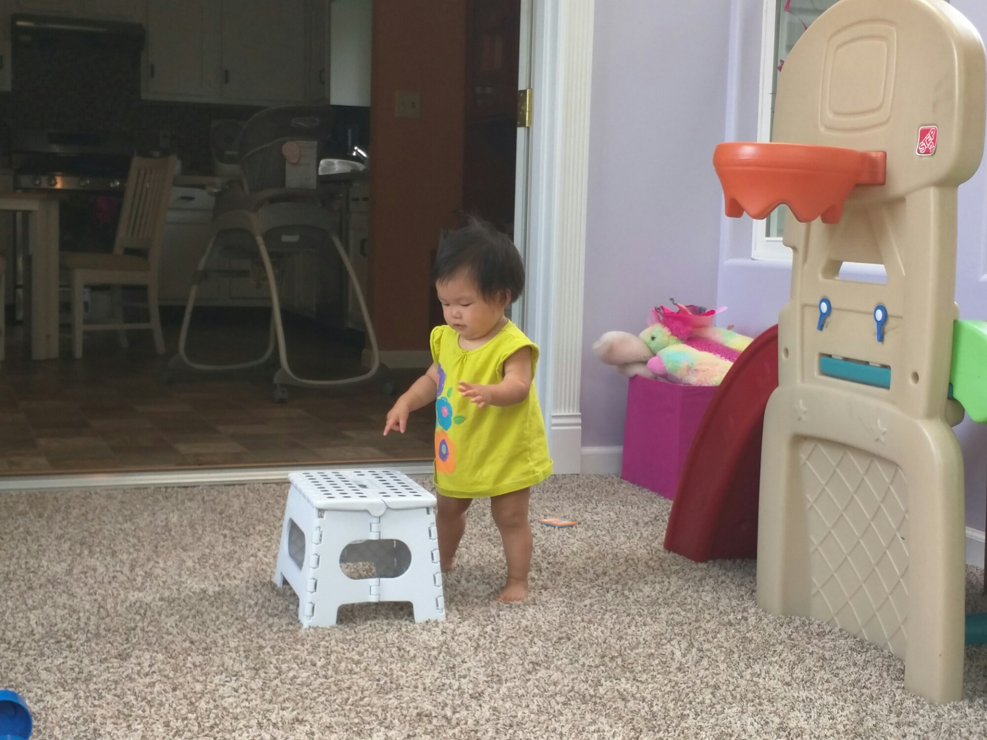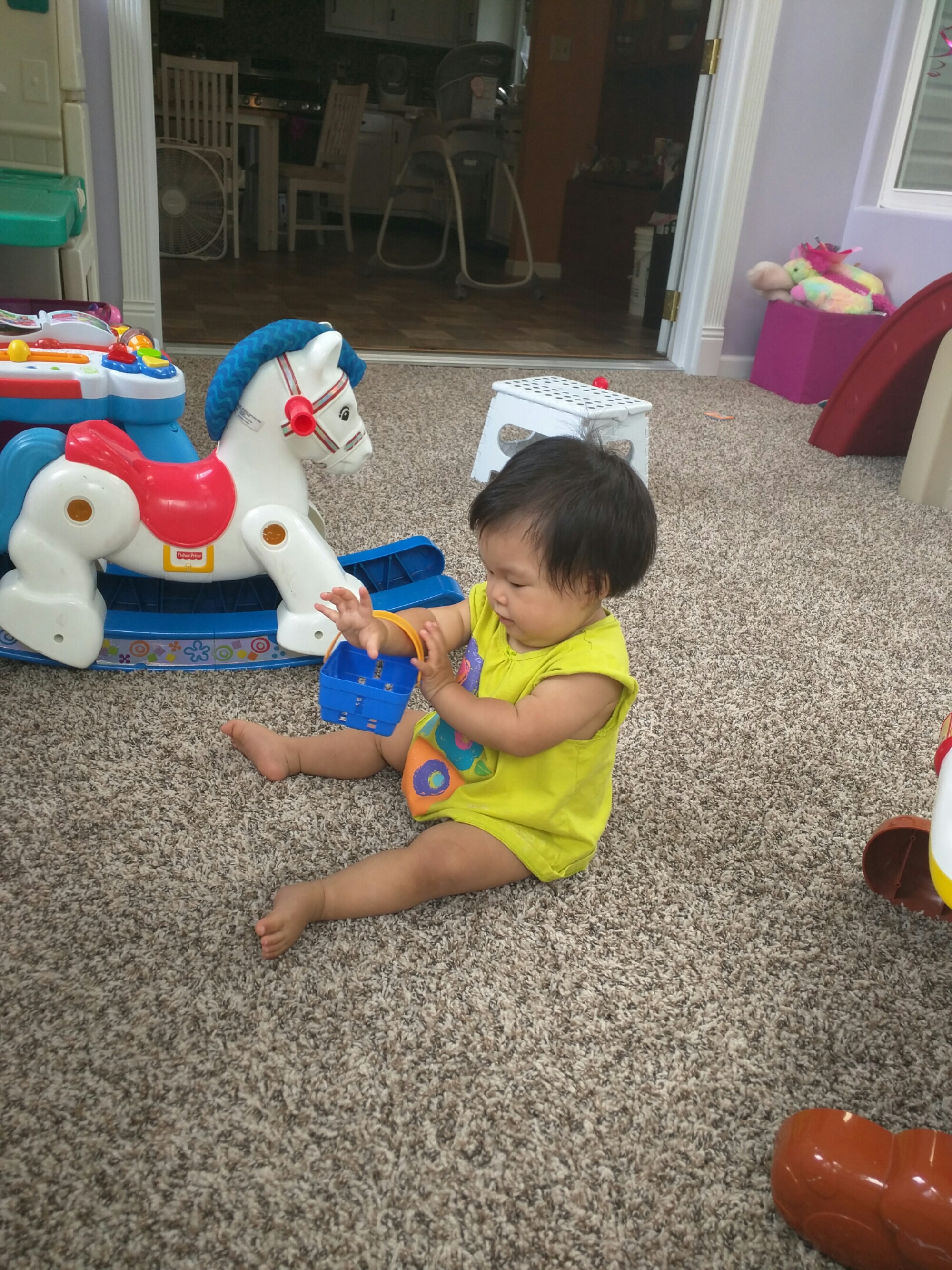 8/23/16 宝贝自己要爬滑梯,今天怎么爬都爬不上来,爬到最后都快哭出来了。爸爸说宝贝肚子饿了没力气爬。开视频和爷爷奶奶视频看宝贝玩。妈妈帮宝贝爬上滑梯,然后拿好多些玩具玩,玩得可认真了。妈妈拿了枕头被子两边围起来,然后宝贝自己玩玩具。宝贝吧玩具两边扔,有个水壶仍下去,捡起来,宝贝又扔,觉得很好玩。宝贝骑马骑得特别好,还会边骑边说“驾驾驾”,晃得马儿向前走。我们晚上去 walmart 把宝贝的 baby food 都买了,买了差不多五十多刀宝贝吃得东西。晚上让宝贝躺着自己睡宝贝都不愿意,被爸爸宠坏了,因为每天晚上爸爸都在房间陪宝贝到睡着。本来爸爸还在工作的,看宝贝自己在房间哭就跑去陪。宝贝前段时间睡得很好,都是睡到被爸爸挖起来。这几天老是半夜醒来就不睡了,已经三四天了吧。