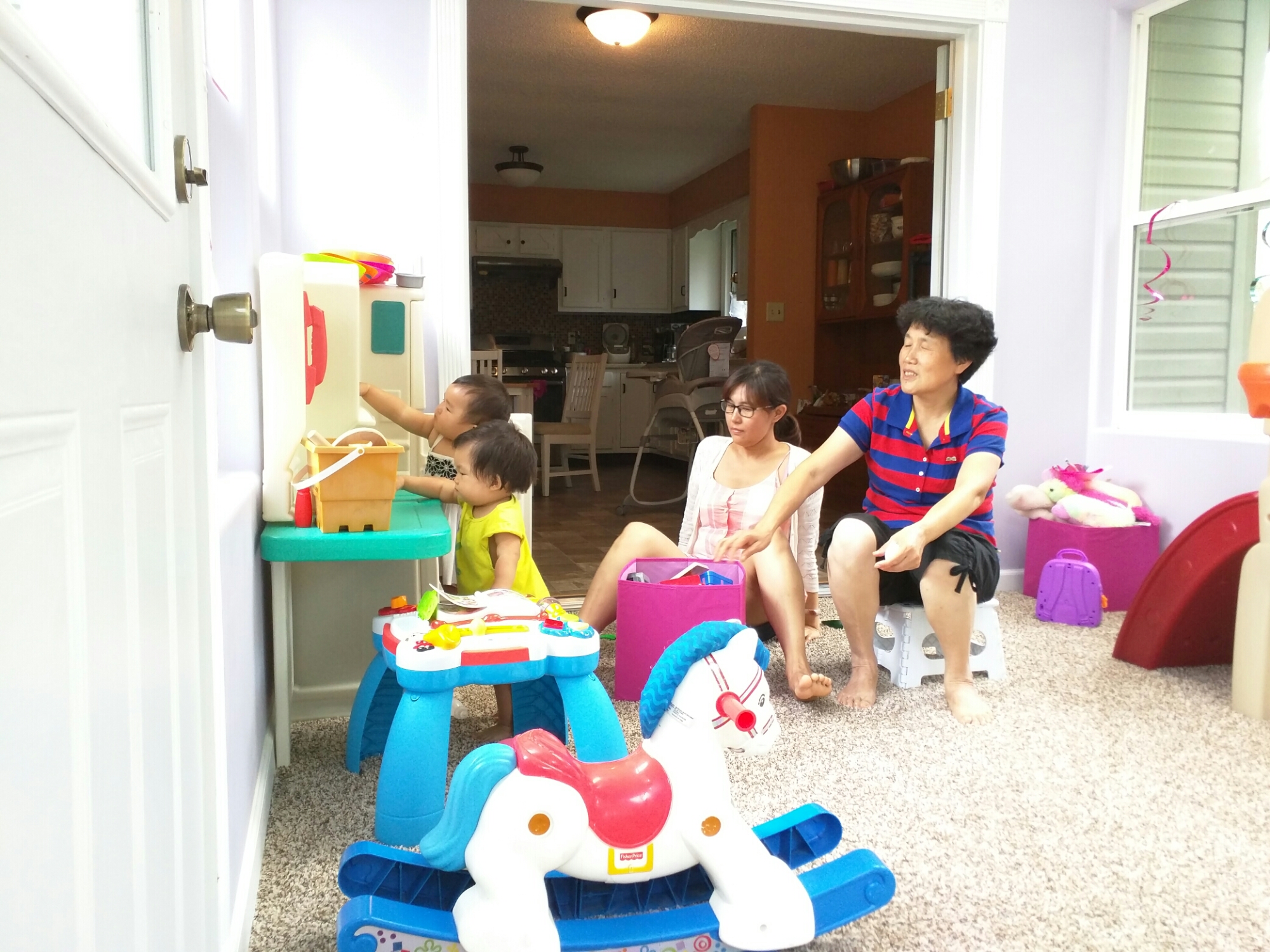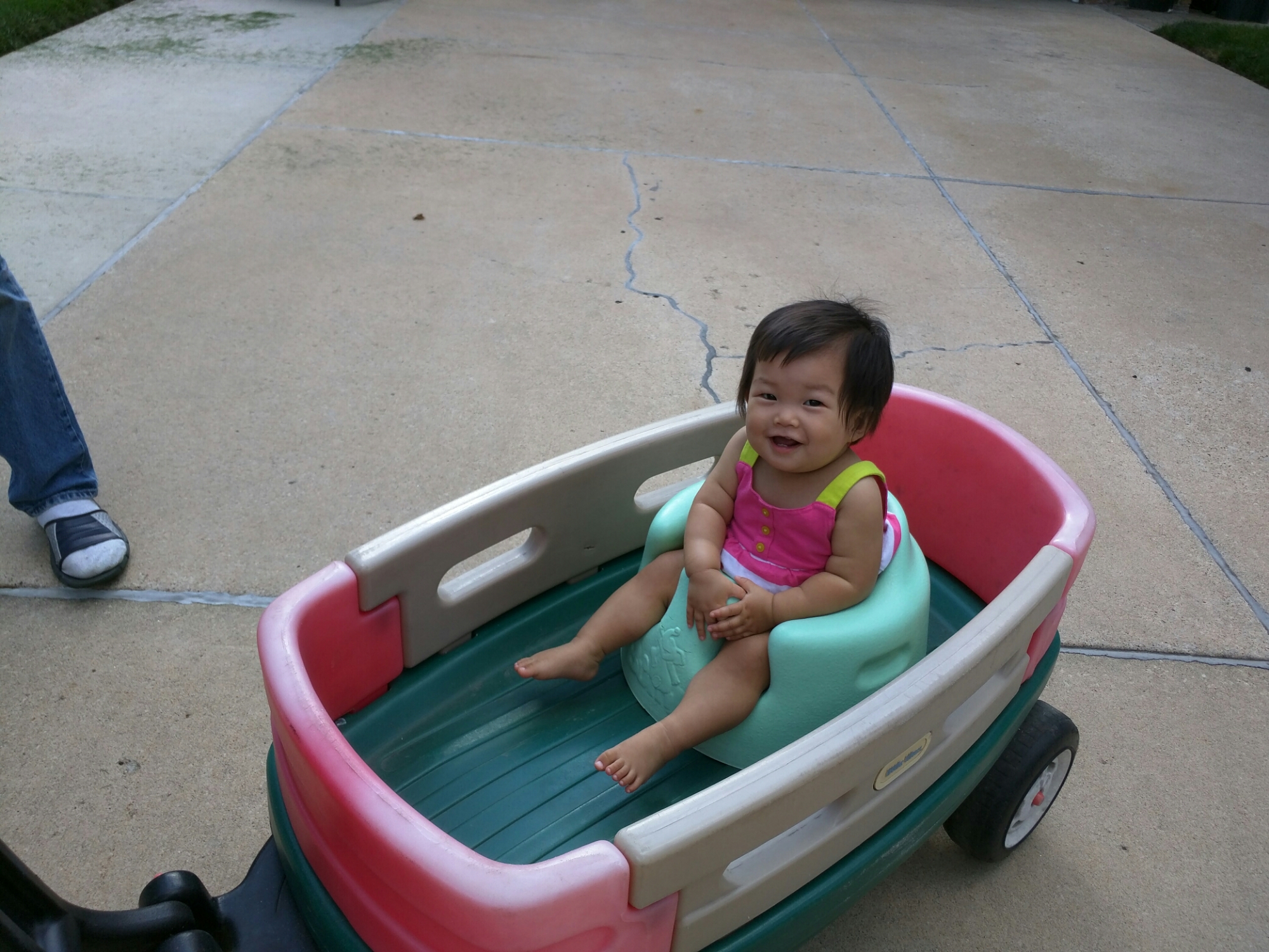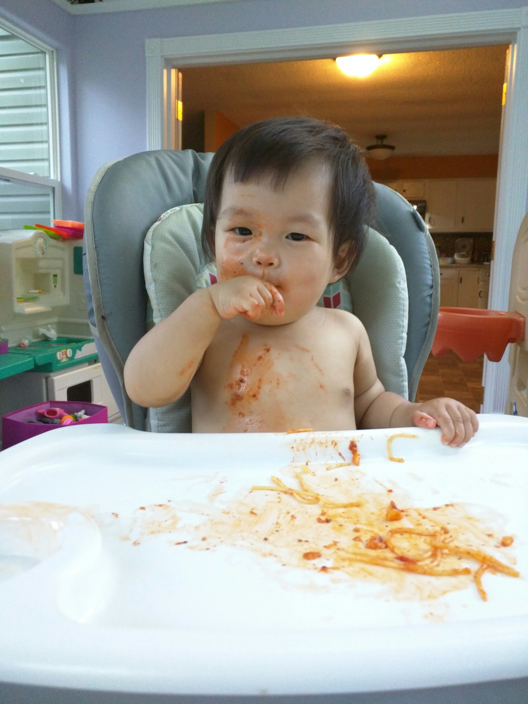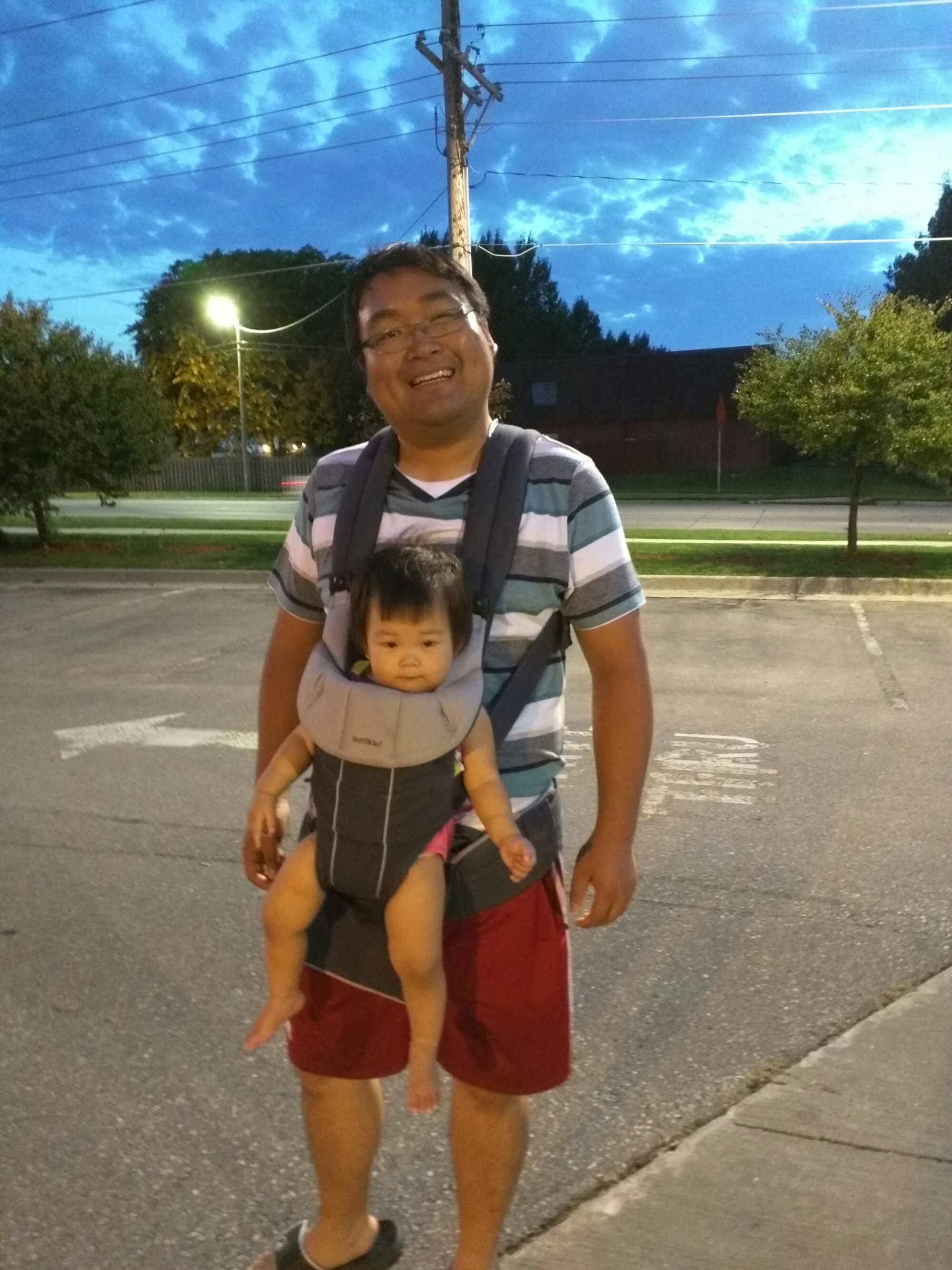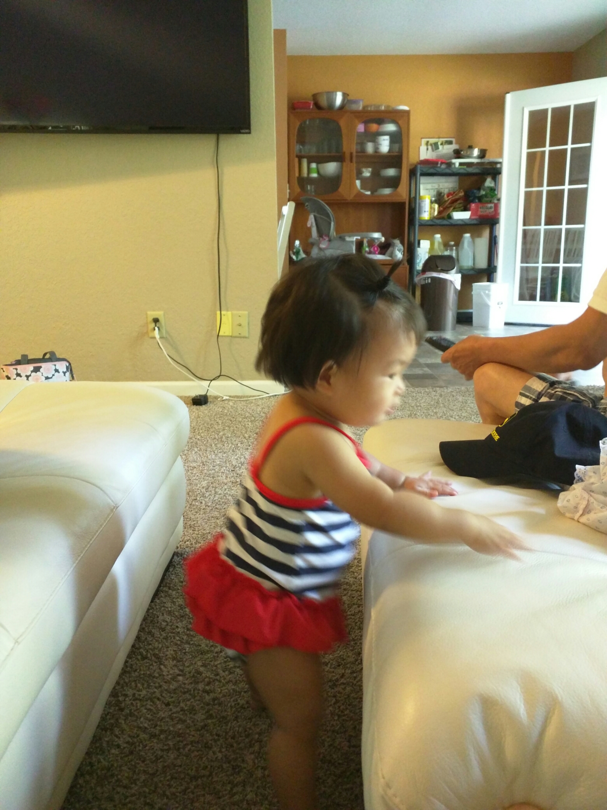 8/16 今天妈妈下班去了趟stuff想买点小东西但没买到,刚好爸爸也要下班了,所以妈妈回家半路上把爸爸接回家,到家刚好 Missy 用 wagon 把宝贝拉出来溜达到 Ben Cyndie 家,所以妈妈刚好把宝贝接回来. Cyndie的女儿来,他们有在外面聊天,所以我们也停在他们家聊一会天, Cyndie 女儿逗宝贝笑,本来宝贝还是害羞的,不过最后还是被逗笑了。回到家让宝贝自己玩玩具,抱抱左手拿个叉子,右手拿个零食,然后有时还想趴滑梯,宝贝喜欢自己拿着玩具厨房里的小玩具然后塞嘴里。晚饭吃完后我们去walgreen 拿医生给宝贝开的配方,可是人家已经关门了,就当作出去溜一圈吧,爸爸用 carrier 把宝贝挂着,宝贝还是很开心的。回家我们在沙发上看电视抠耳朵。宝贝本来自己玩得好好的,后来也想爬到沙发来,宝贝一直亲妈妈的大腿还一直吹,把妈妈弄得好痒于是一直笑,看到妈妈一直笑宝贝可是越吹越起劲,边吹边自己笑得好开心。