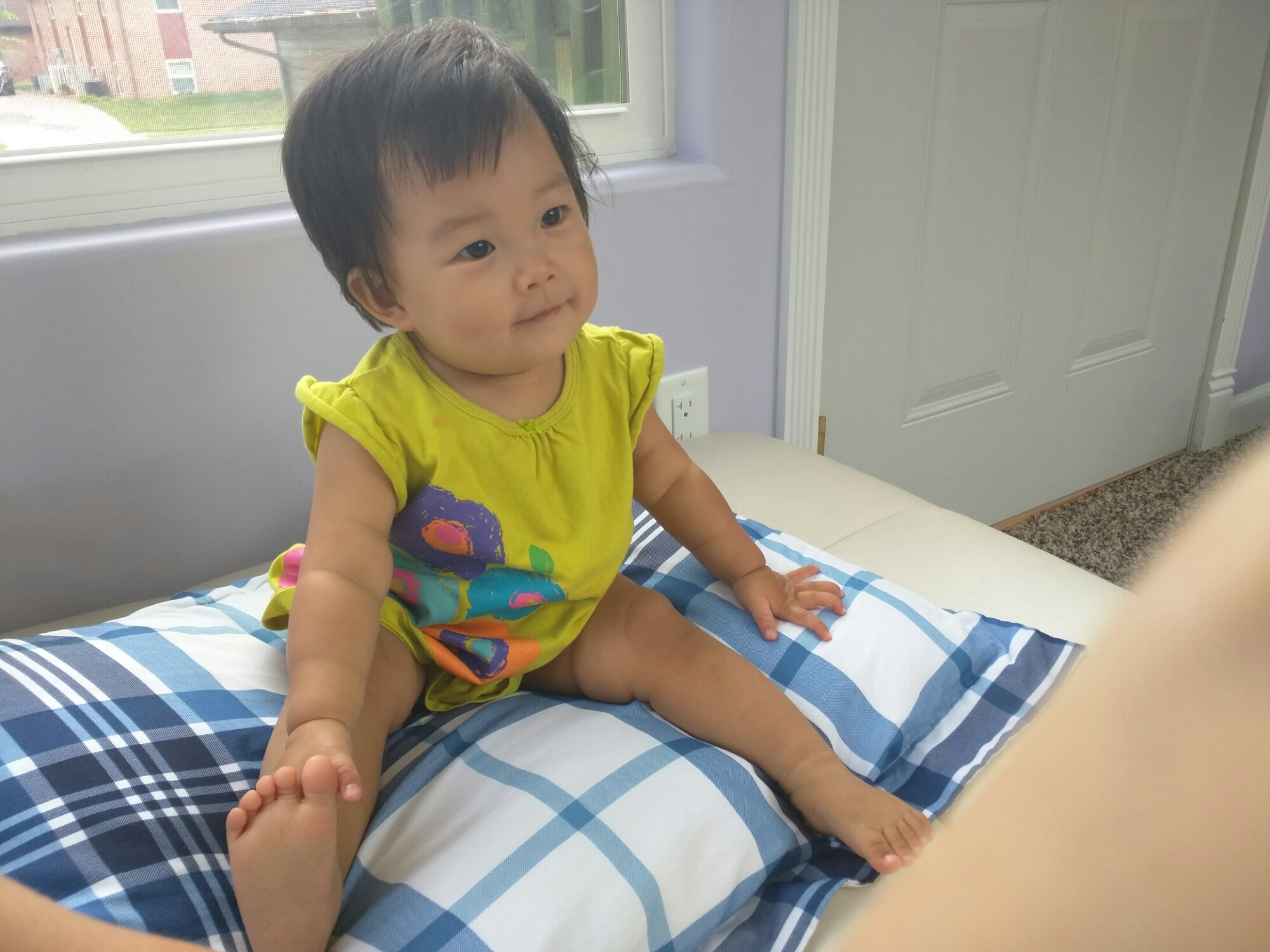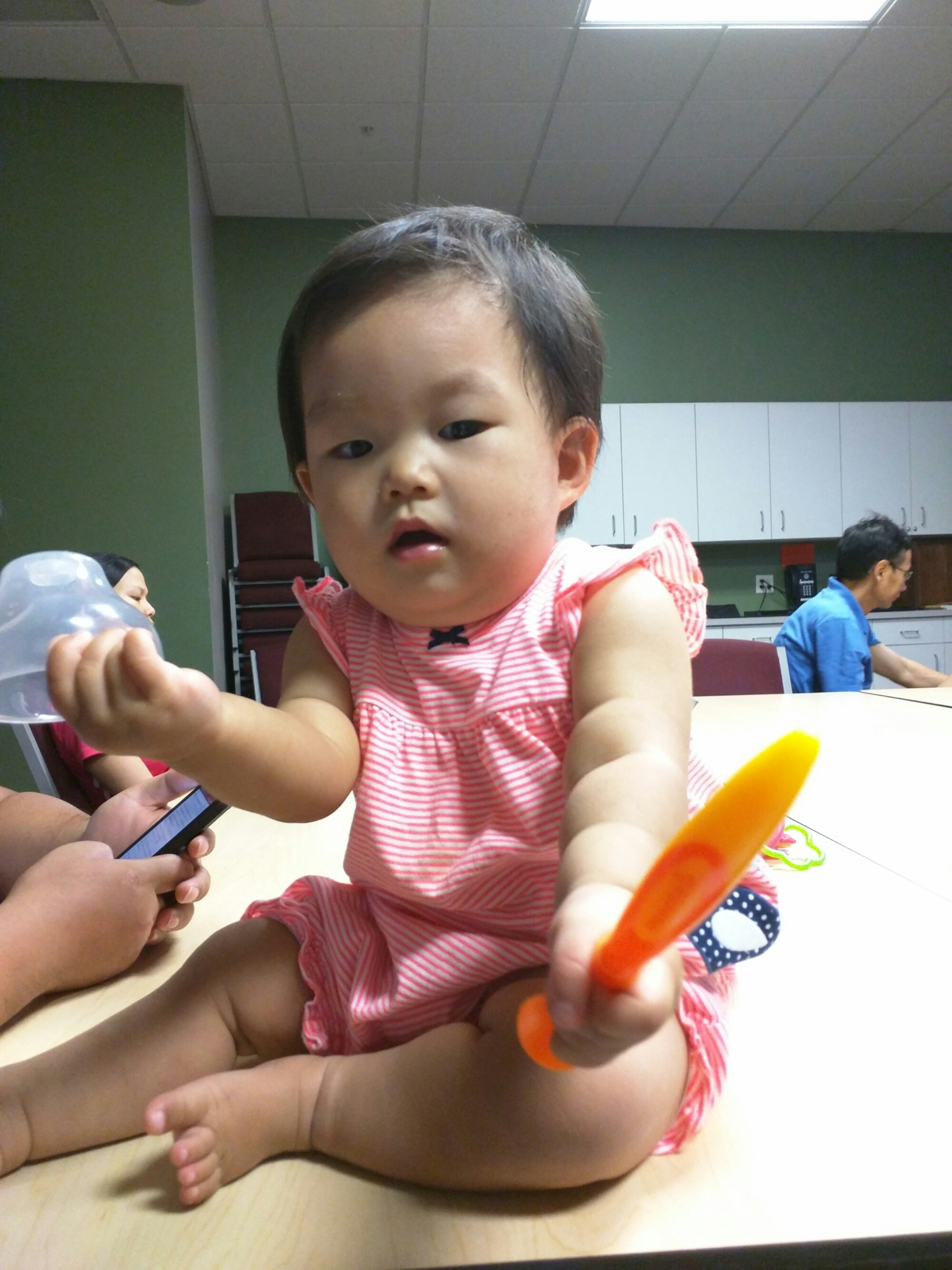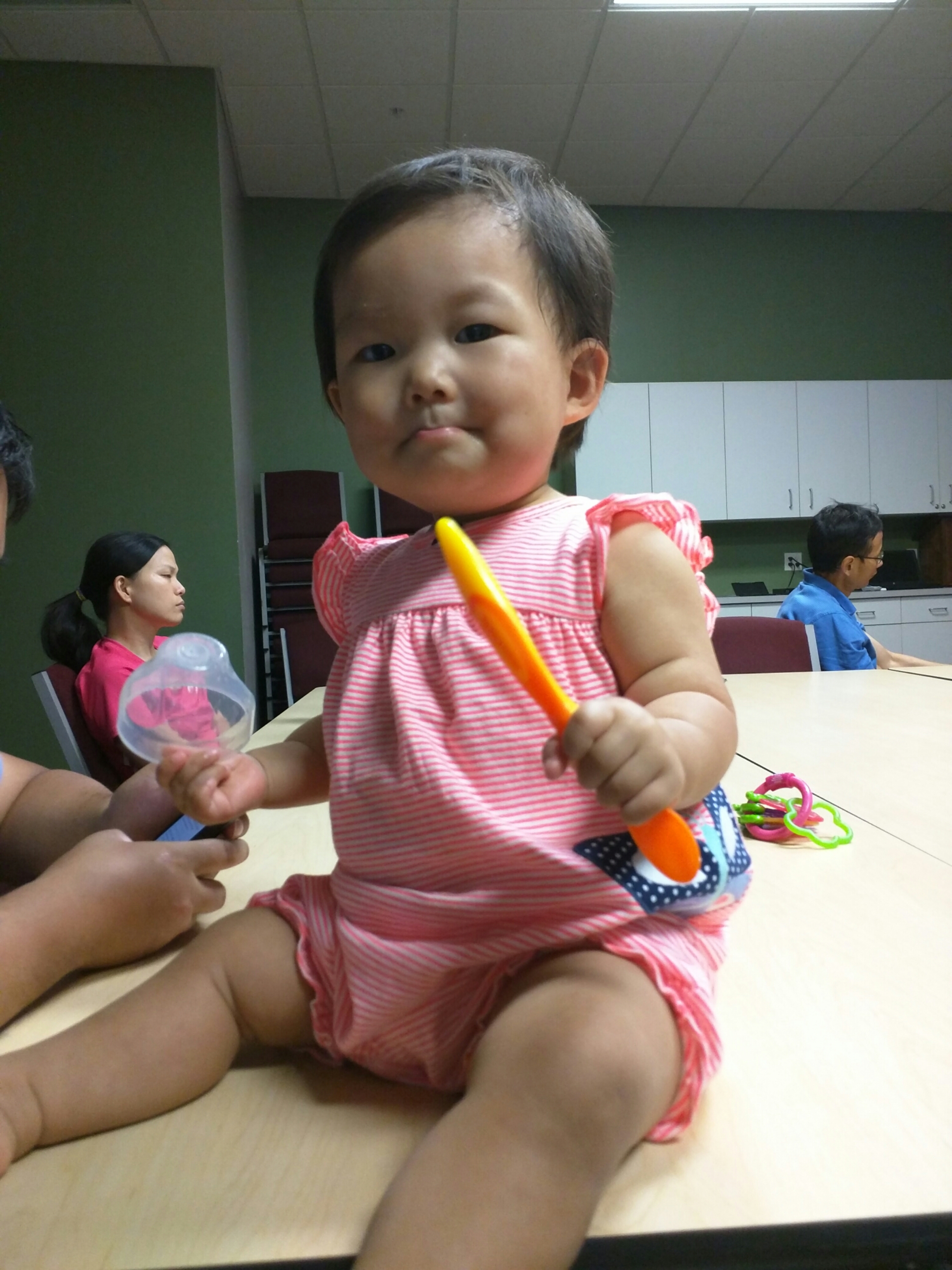 8/7 Mommy had to work at Marion Hy-vee today to swap with a weekend with someone. We had an appointment at 3pm and mommy got off at 2:15. We were planning to let daddy drop off mommy off and then bring lunch over to Marion Hy-vee then go to the appointment together, but we both forgot about it in the morning and mommy drove the car to work. Daddy was worried that mommy had no lunch so he packed lunch and held baby Charlotte on arms and walked to Hy-vee for like 1 hour and 40 minutes. I would never guessed daddy would walk that far. We got to Dr. Pat’s just in time. There’s a girl sitting at the waiting area and baby just smile at her so excited and walked around the table.