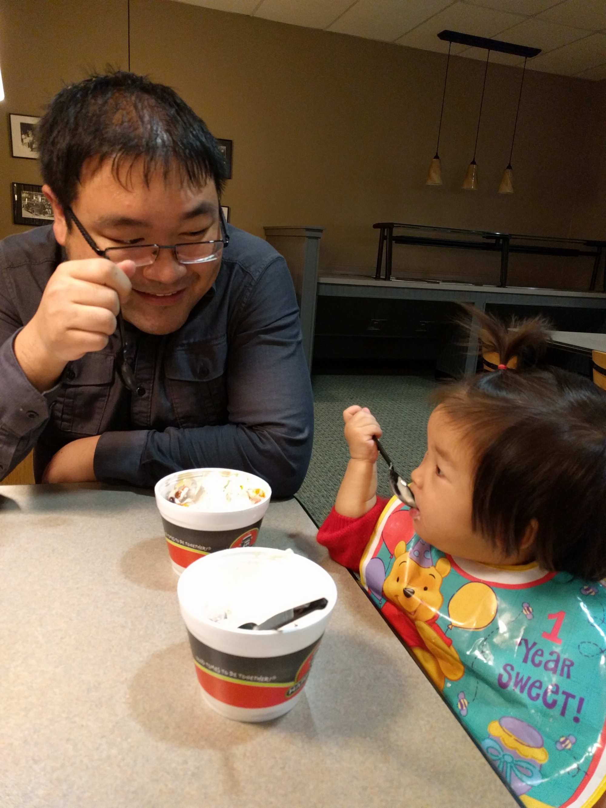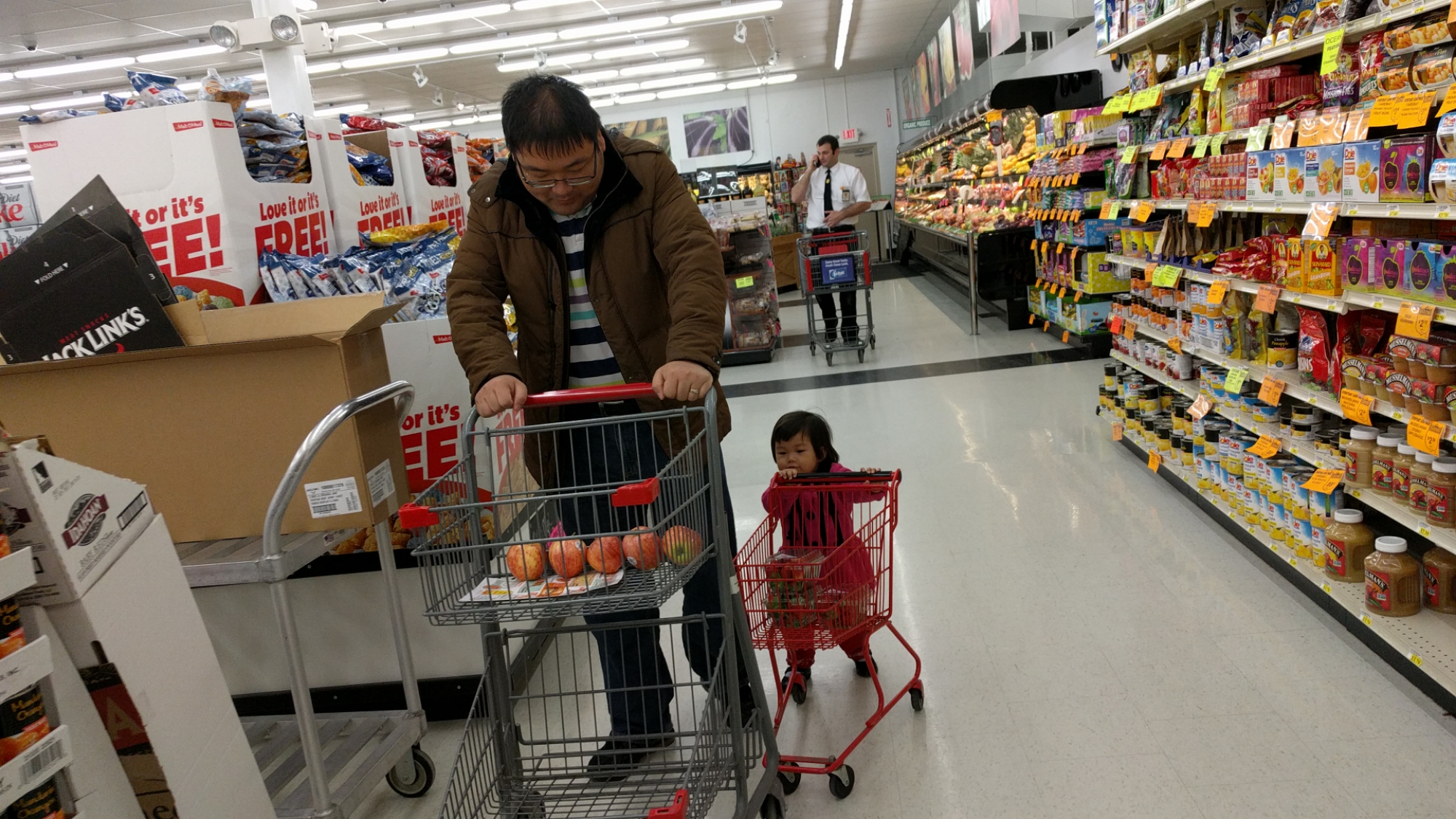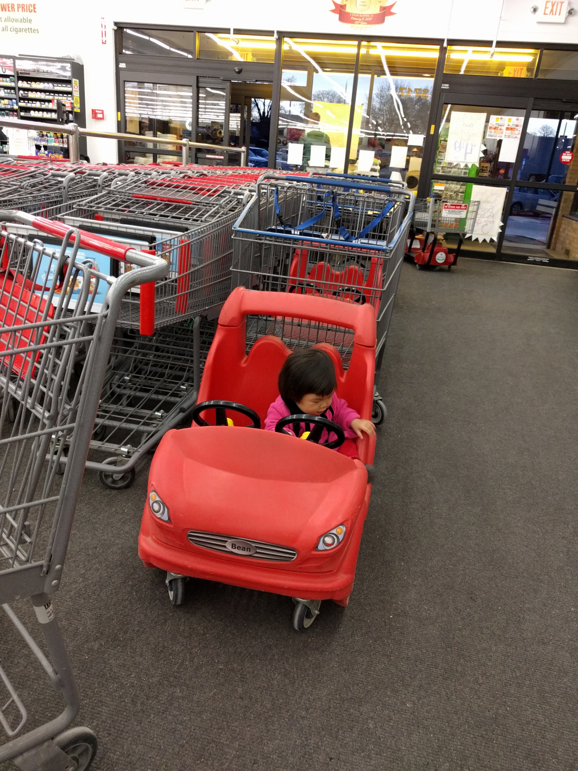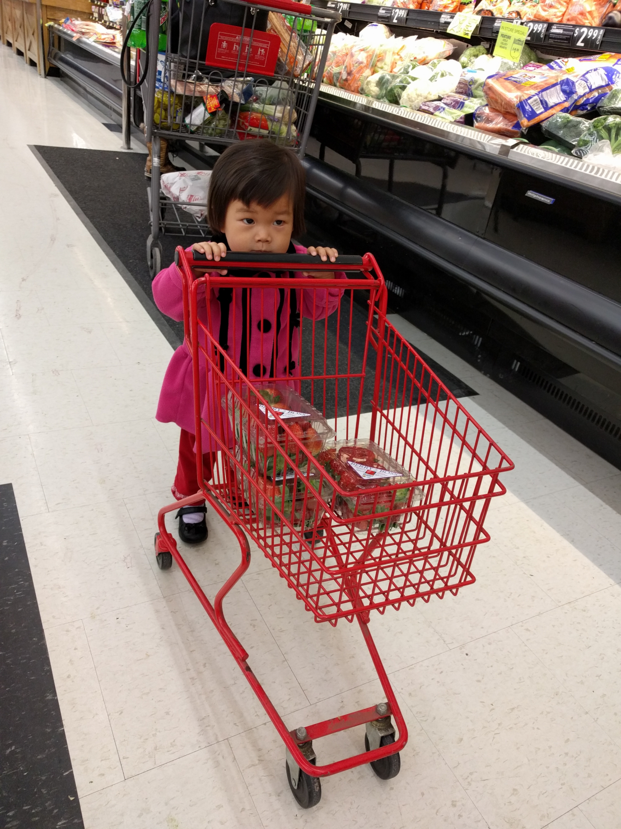 我们去fareway 买东西,给宝贝自己推了个儿童购物车可开心了,很认真地推着车跟着爸爸妈妈走,不会像以前到店里就乱跑。宝贝看到东西也会去摸摸,还自己要拿cereals,太重了都放不进去。旁边的顾客看到宝贝有的看着宝贝笑,有的停下来和宝贝打招呼问候下。整个购物有趣多了。到结帐要出来时,宝贝看到购物车加玩具车车就要坐在里面开都不愿意走,妈妈硬抱出来宝贝哭的好大声