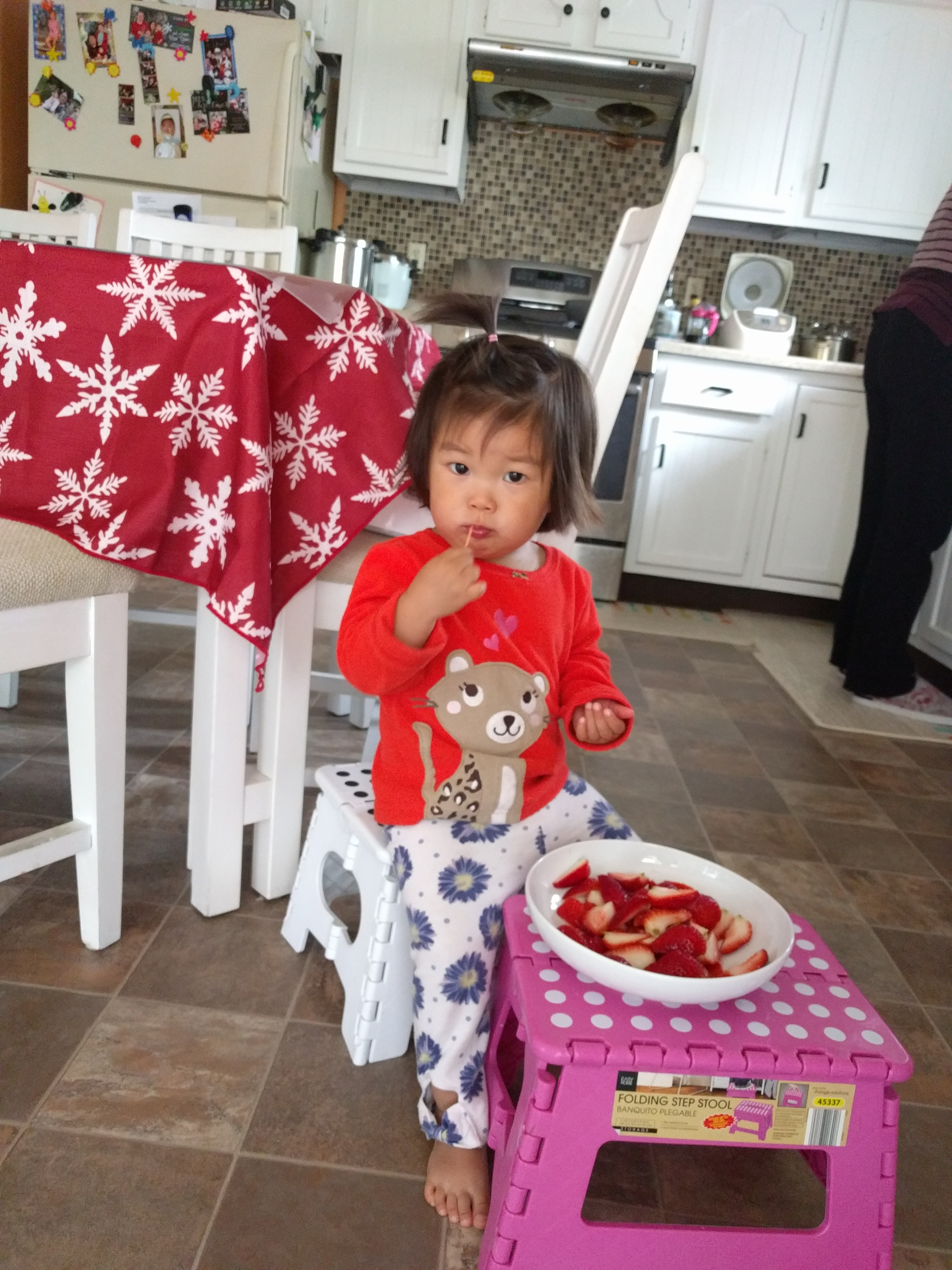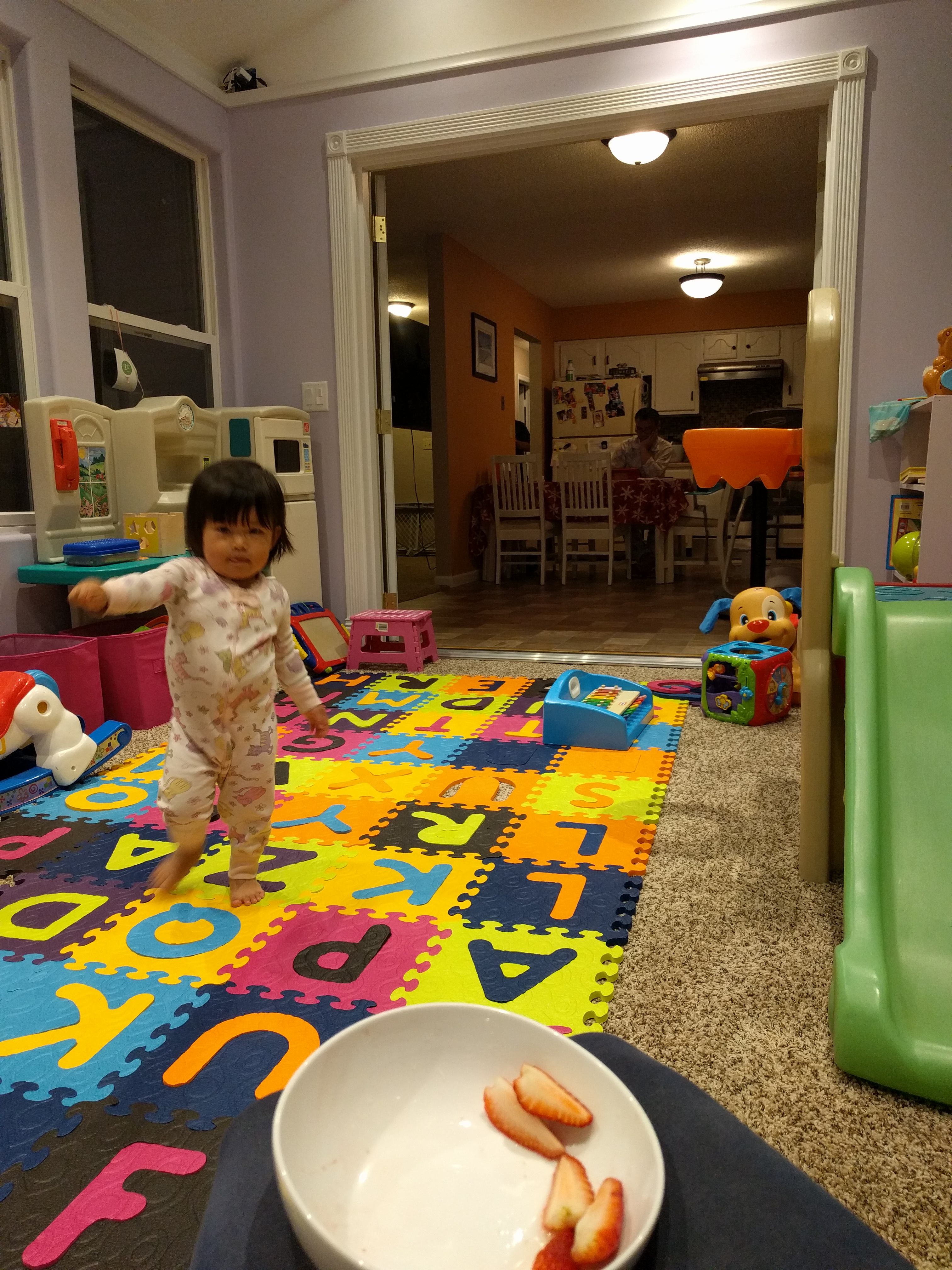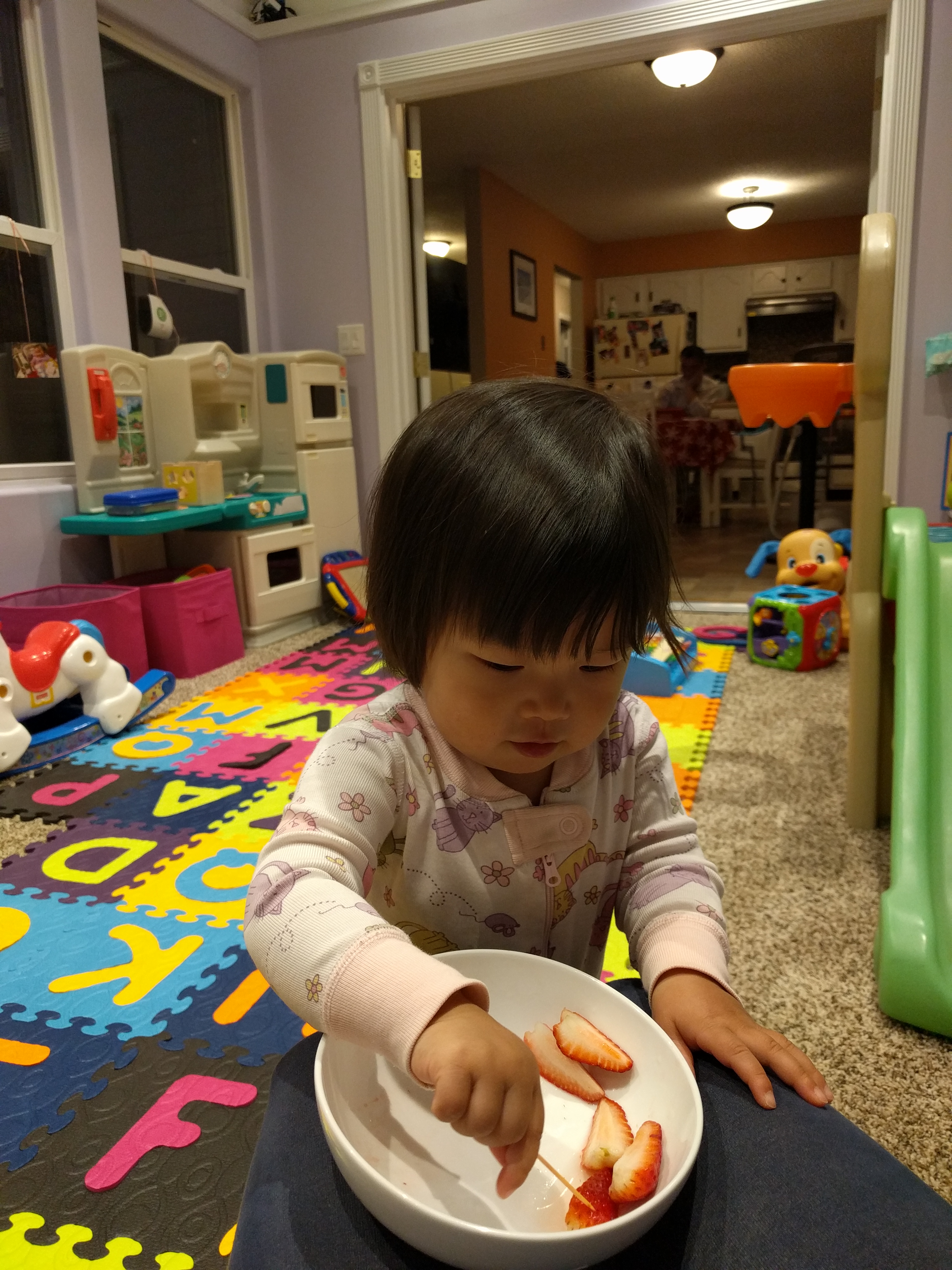 宝贝好棒,吃草莓老是要给爸爸妈妈吃。给爷爷吃爷爷觉得太酸了,于是拿来给妈妈。听到爸爸从房间走出来宝贝插着草莓从玩具房跑到 Hallway 去喂爸爸,这样来回跑了十来趟,有时走到一半自己吃了,又跑到妈妈这边插一个跑去给爸爸吃,实在是懂得分享的好孩子