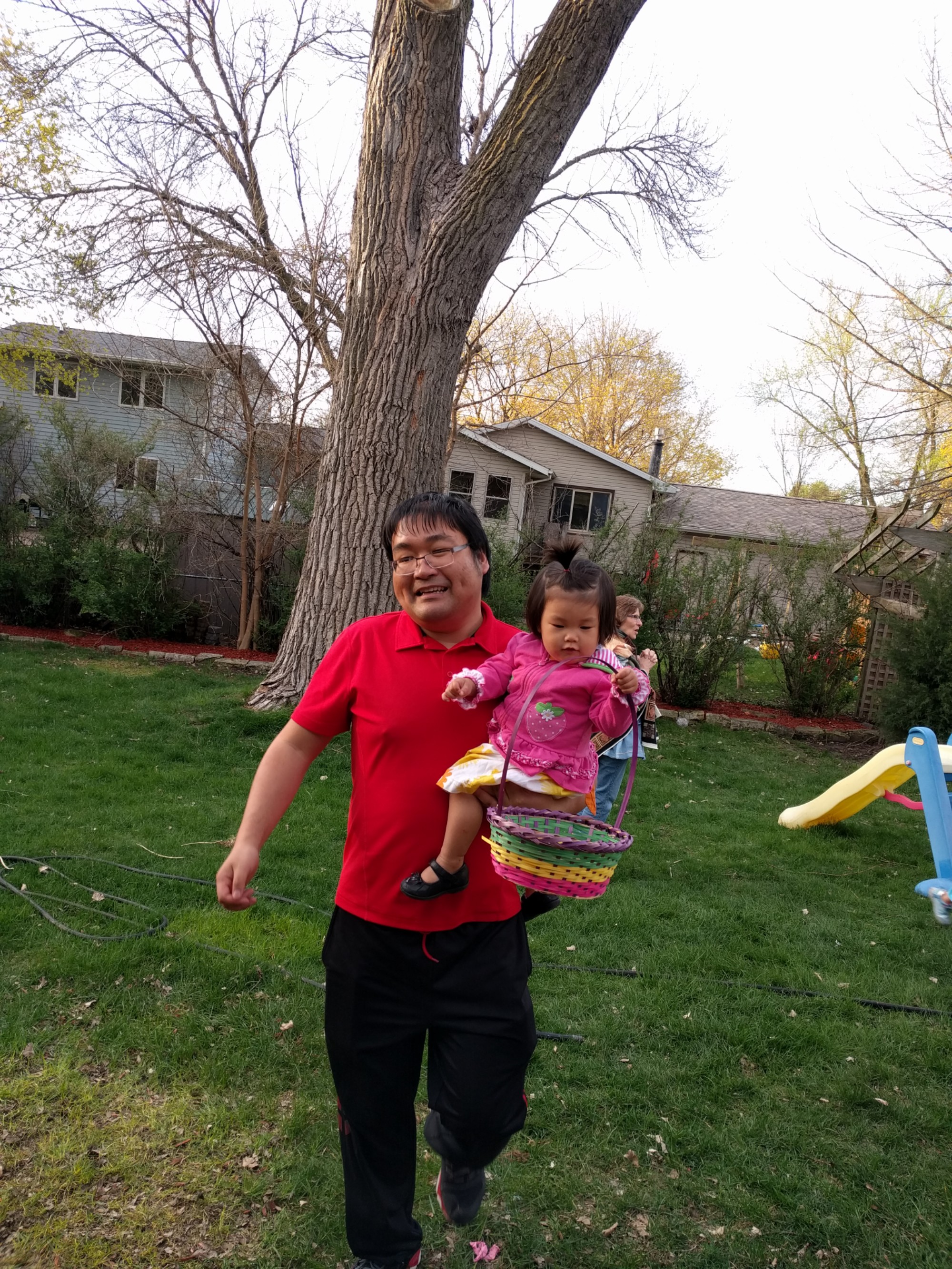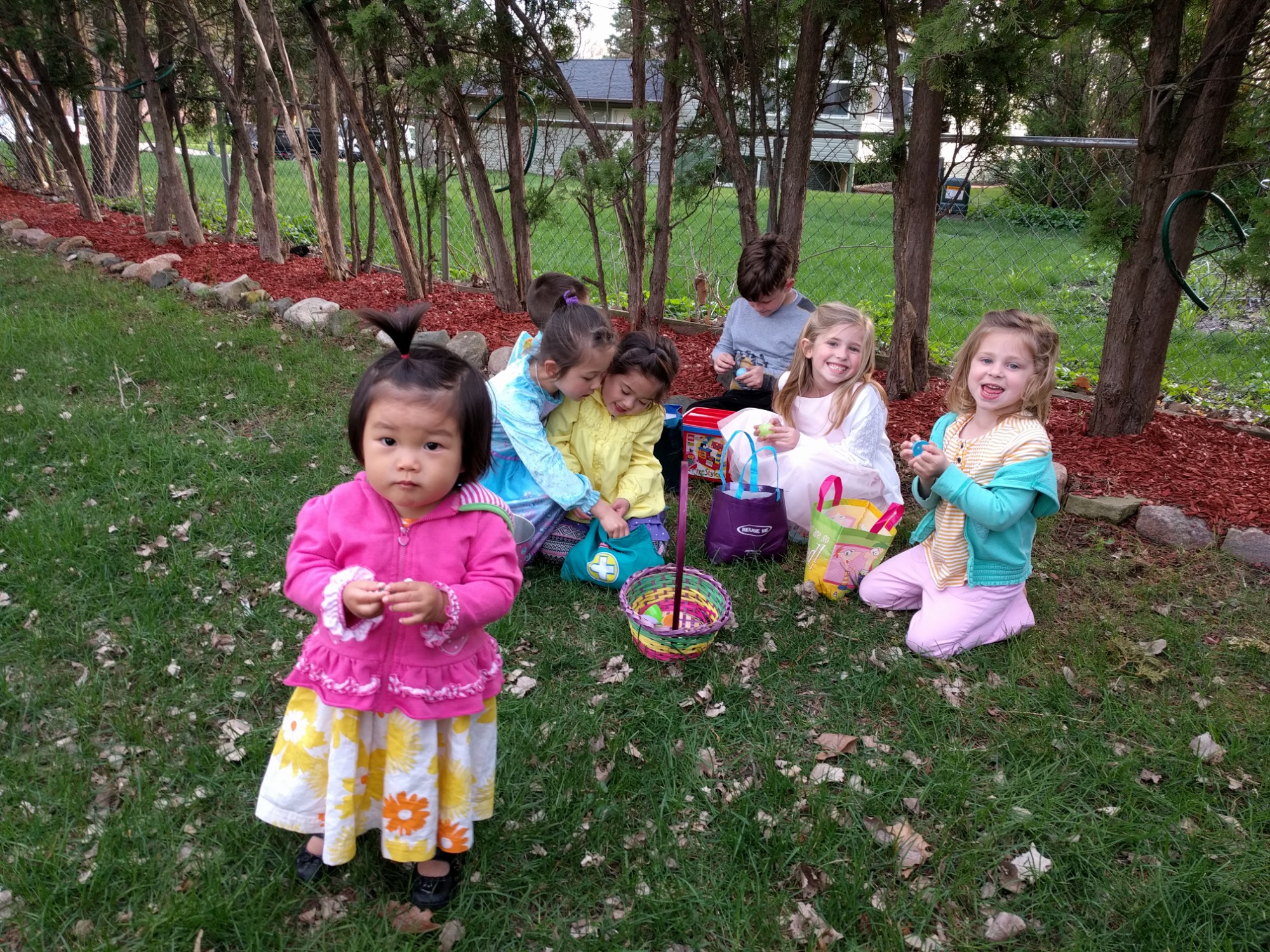 星期天我们和外公去了华人教会,回来碰到菲菲他们在 Cyndi’s 他们家玩,看到我们回来他们也都跑我们家玩,外公把外面的滑梯洗了一下菲菲,贤贤和宝贝一起玩,然后也骑车车。贤贤留在我们家玩一会,宝贝和他在玩具房里玩,看到贤贤在窗户那边叫他爸爸,宝贝也跟着一起往窗外叫。 晚上我们到二姨家聚餐,然后小朋友们一起在后院找鸡蛋,宝贝开始有些意识了,和宝贝说这边有鸡蛋,宝贝就会过来捡放入自己篮子里,捡了有五个,已经很棒了,最后宝贝把里头的糖都扒出来吃了