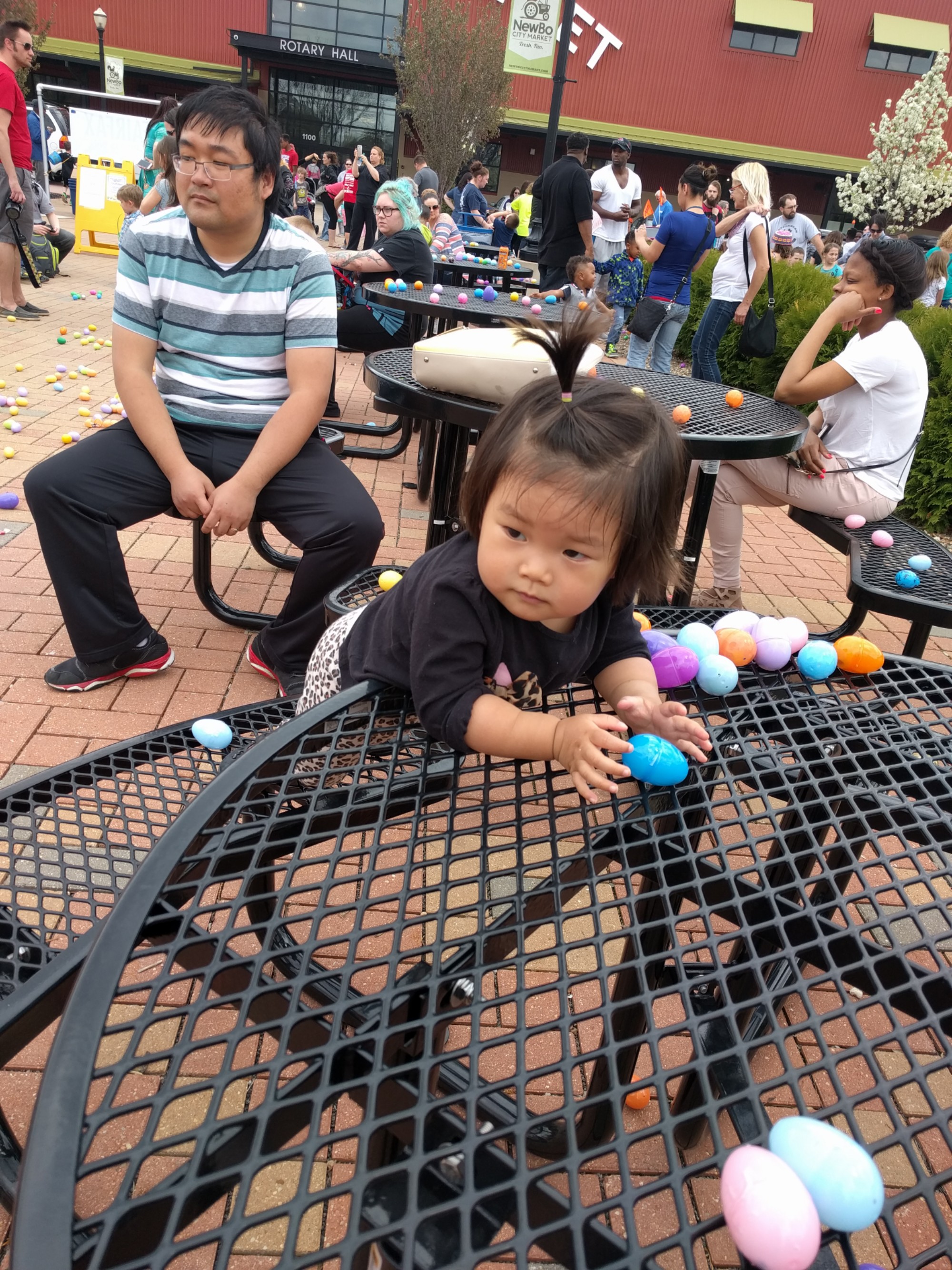 星期六爸爸妈妈带着宝贝去 newbo market 捡鸡蛋,去的还算早,我们就在操场等,里头全是鸡蛋,宝贝开始玩起了鸡蛋,鸡蛋里有些糖掉出来了,宝贝就专门捡糖要吃。等一点到了可以开始捡,本来以为可以多捡些,但是一开始就结束了,那么多鸡蛋十几秒就被捡光了,小朋友太多了,而宝贝都没在捡,只顾着捡地上的糖要打开。我们也碰到了三姨他们来。回家的路上宝贝睡着了,爸爸回去加班,到家宝贝就在车里睡了两个多小时